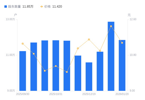 日期A股户数(户)流通A股户均持股数(股)户均持股市值(万元)2026-01-201185018889.5010.152026-01-091286978185.2310.042025-12-311119149412.7110.372025-12-191059109946.0711.532025-12-101097369599.3010.692025-11-201180928920.018.882025-10-311183008904.329.132025-10-201182358909.228.922025-10-101170778997.349.782025-09-301122449384.7510.68